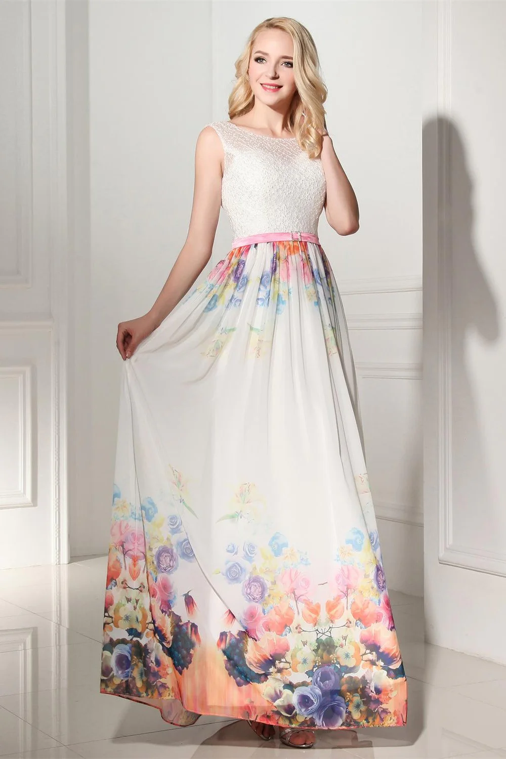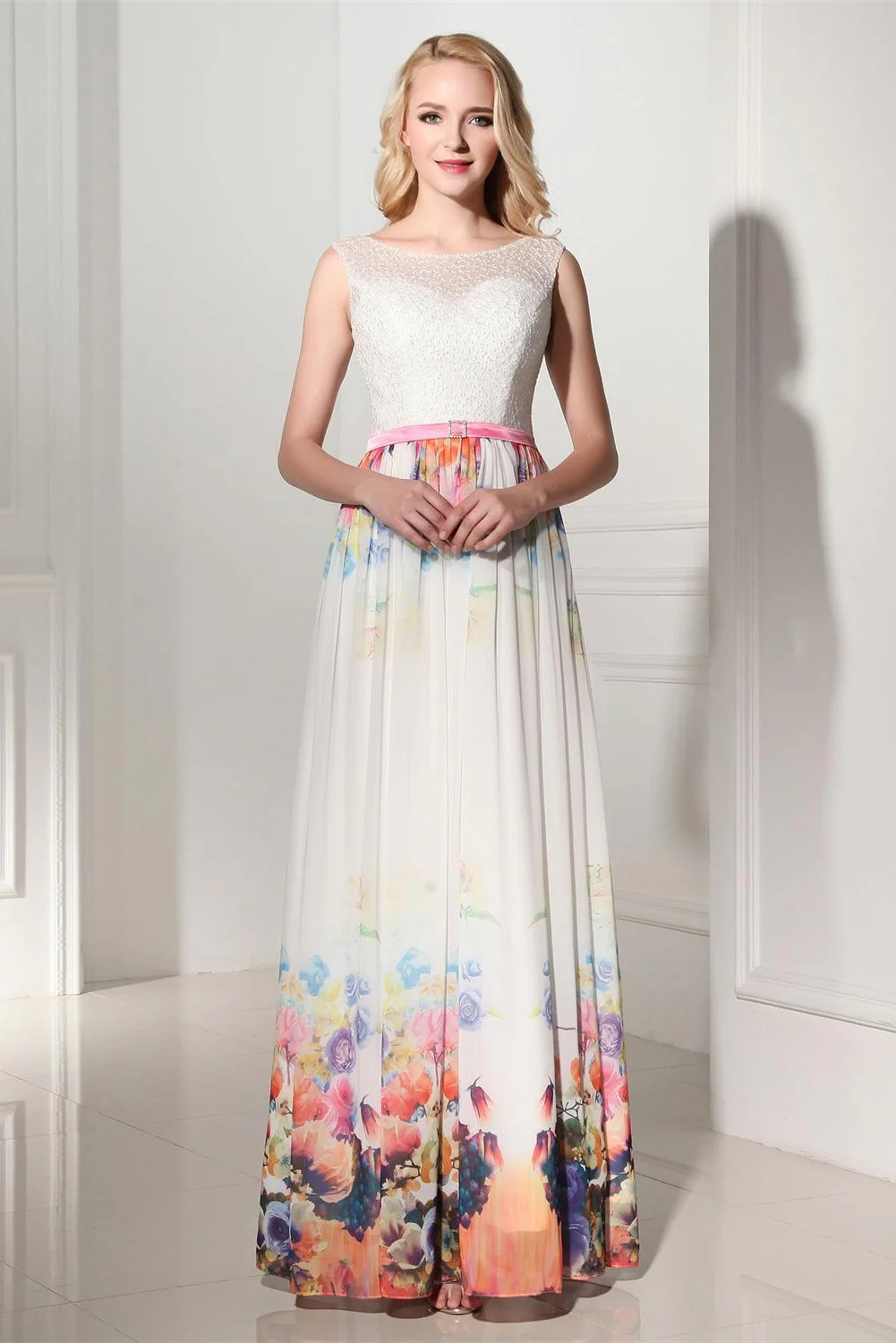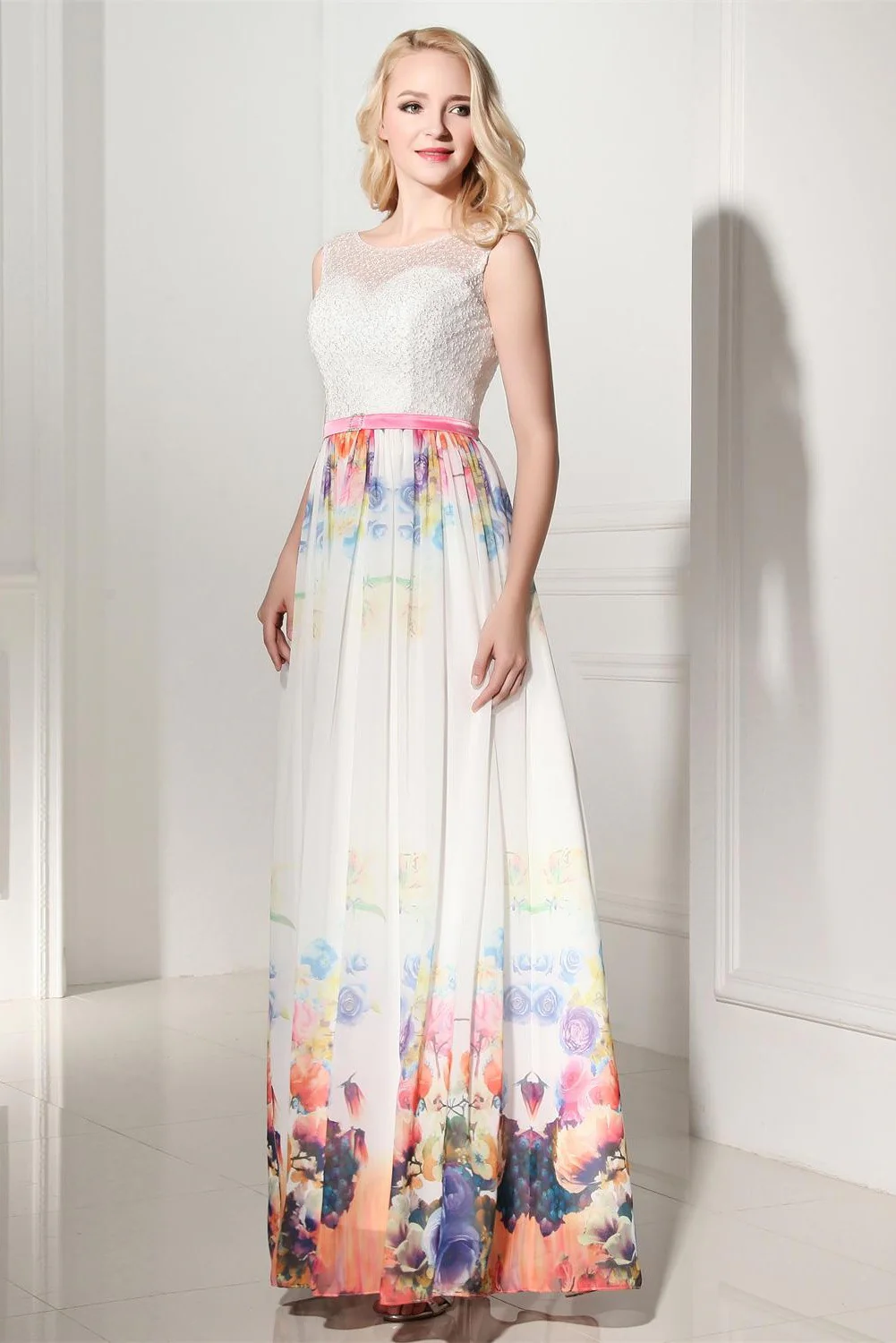 Pretty Long Cap Sleeves Printed Chiffon Charming Prom Dresses K115