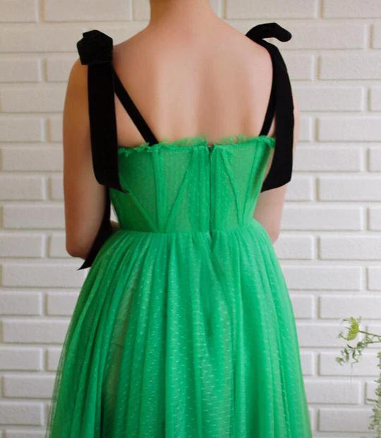 • A-line Black Straps Sage Long Charming Prom Dress Tulle Evening Dress OKS97
