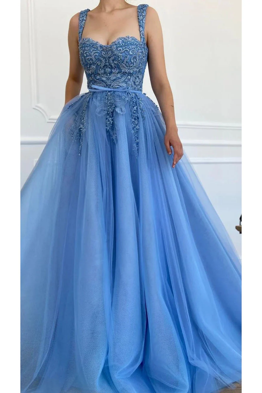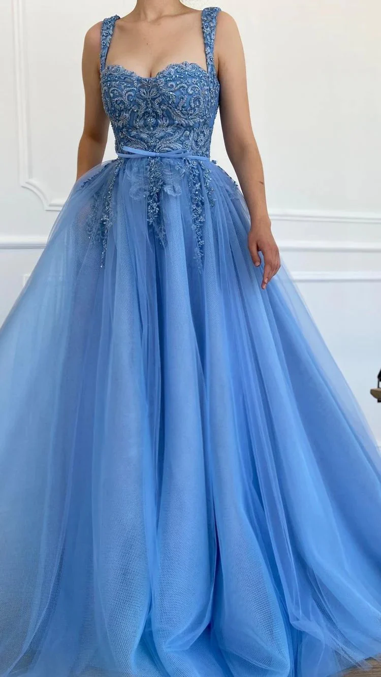 • A Line Blue Appliques Prom Dress Long Formal Evening Party Dress Celebrity Gown OK1633