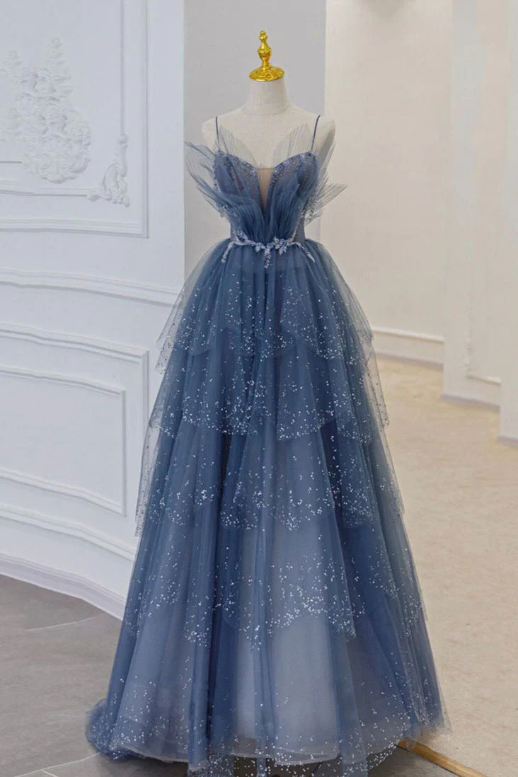 A Line Blue Tulle Long Prom Dress Spaghetti Straps Evening Party Dress OK1170/OK1932