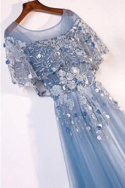 A-Line Blue Tulle Short Sleeves Long Lace Up Formal Evening Prom Dress OKF29