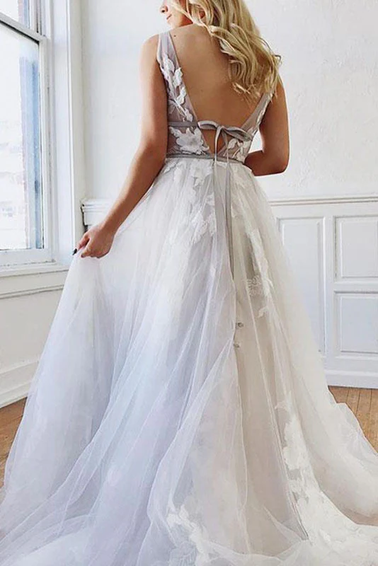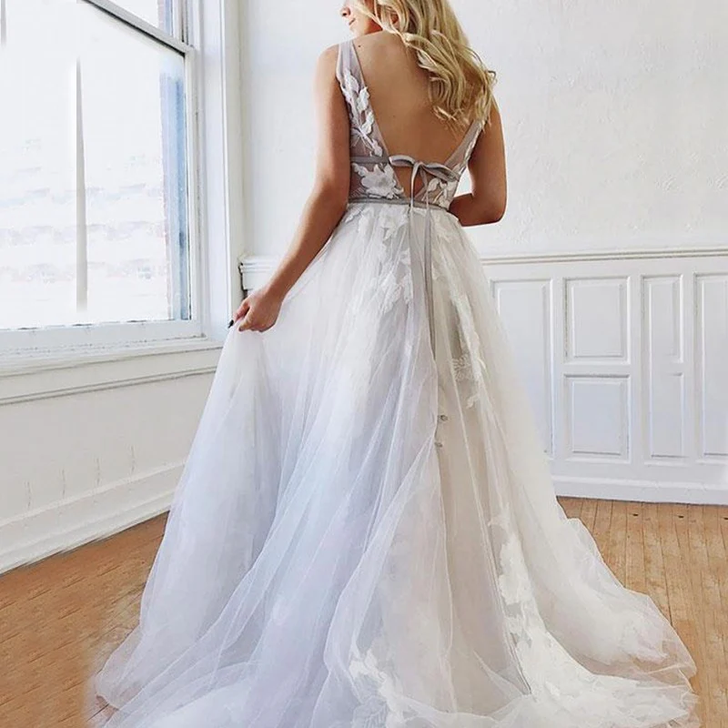 • A Line Deep V-Neck Backless White Tulle Prom Dresses With Appliques OKQ63