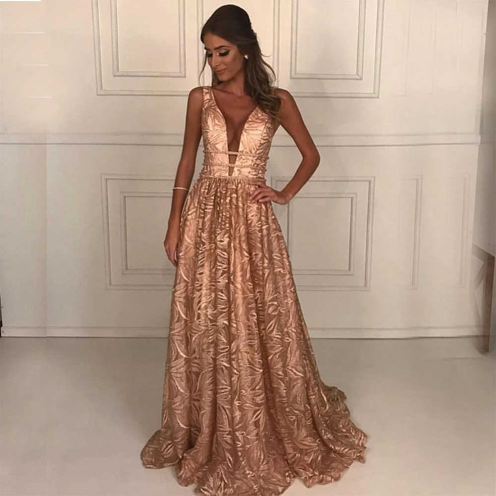• Fashion A-Line Deep V-Neck Floor-Length Lace Prom Dress with Beading OKK72