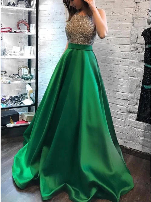 • A-Line Halter Backless Sweep Train Royal Blue Prom Dresses with Beading Pockets OKN33