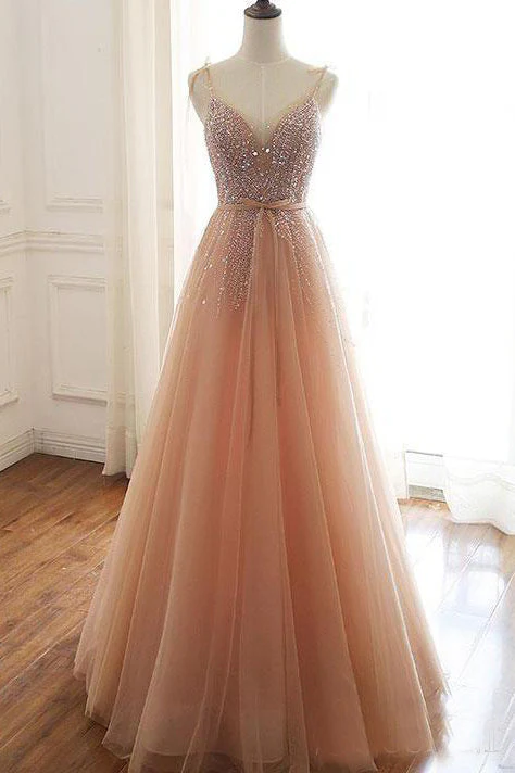 • A-line Lace Up Back Spaghetti Straps Evening Dress Coral Tulle Sequins Prom Dress OKS15