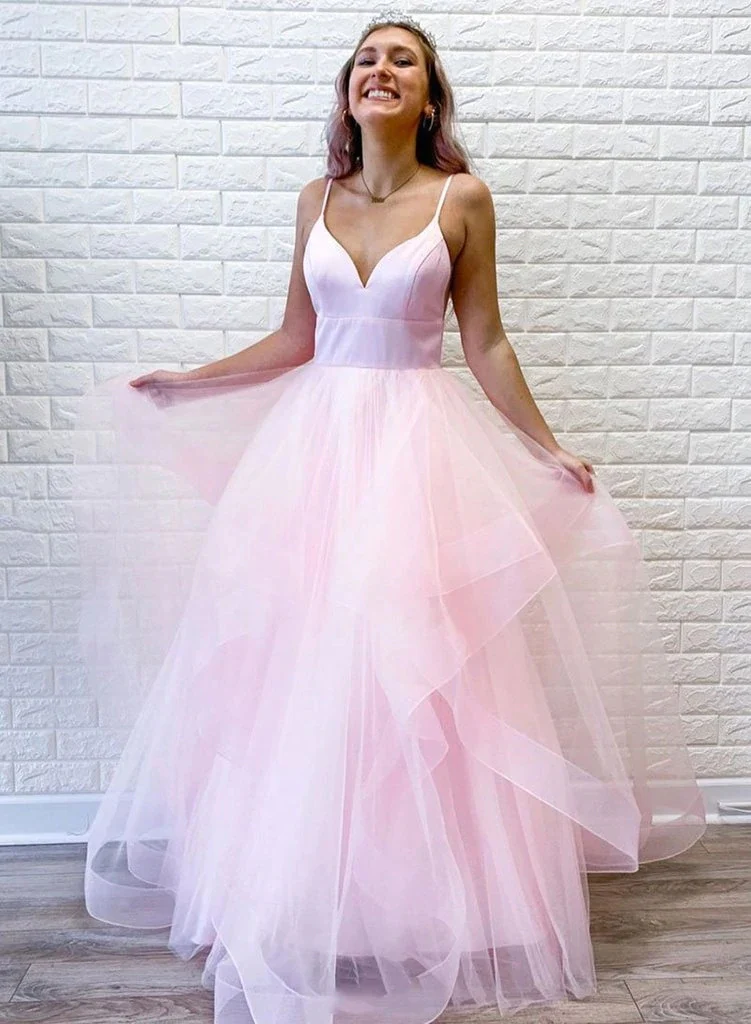A Line Pink Tulle Long Prom Dress With Ruffles Spaghetti Straps Evening Dress OK1336