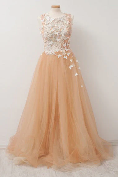 • A Line Round Neck Tulle Long Prom Dress with Lace Appliques OKU29