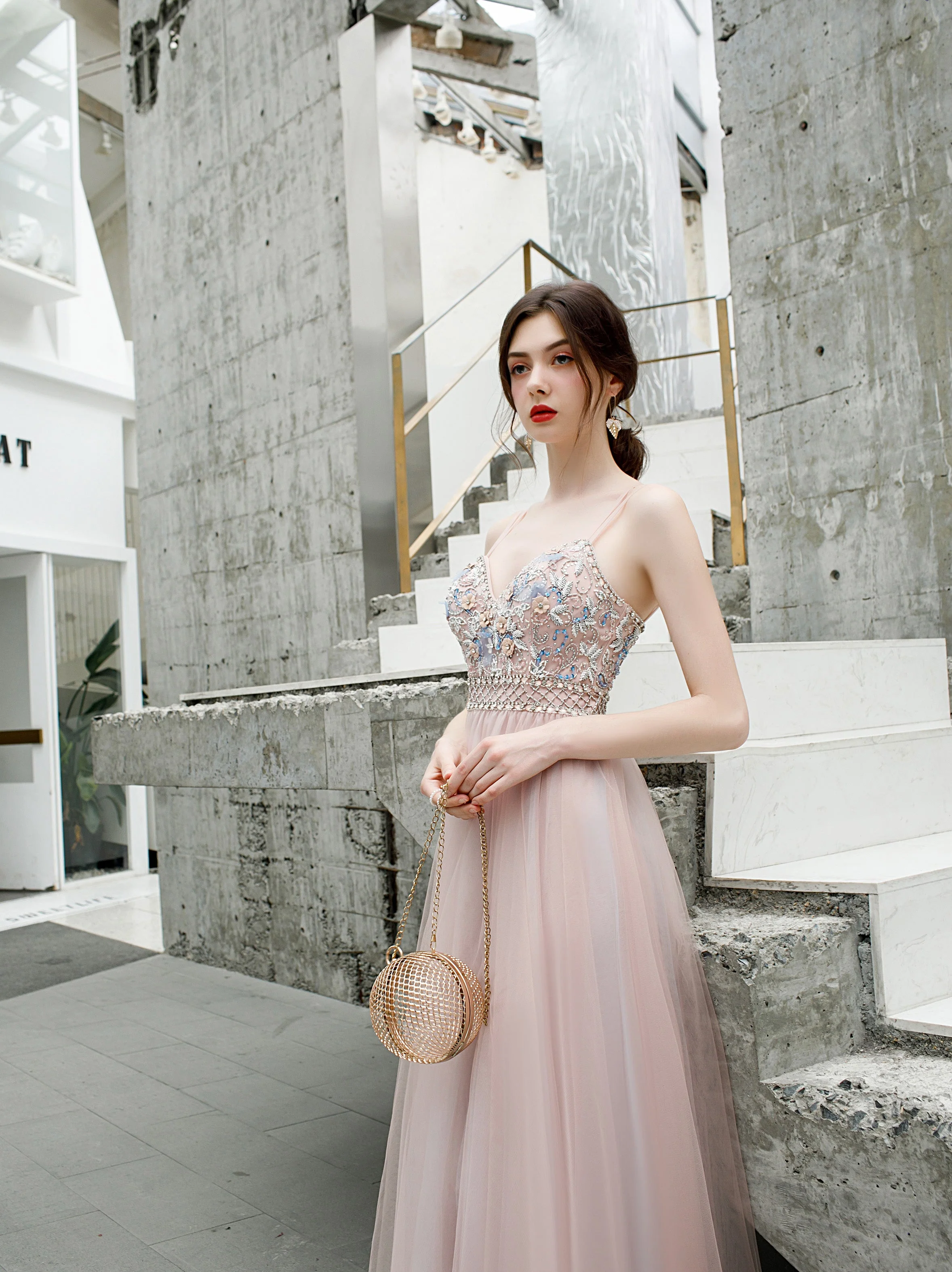 • A-line Spaghetti Straps Beaded Long Tulle Prom Dress OKT23