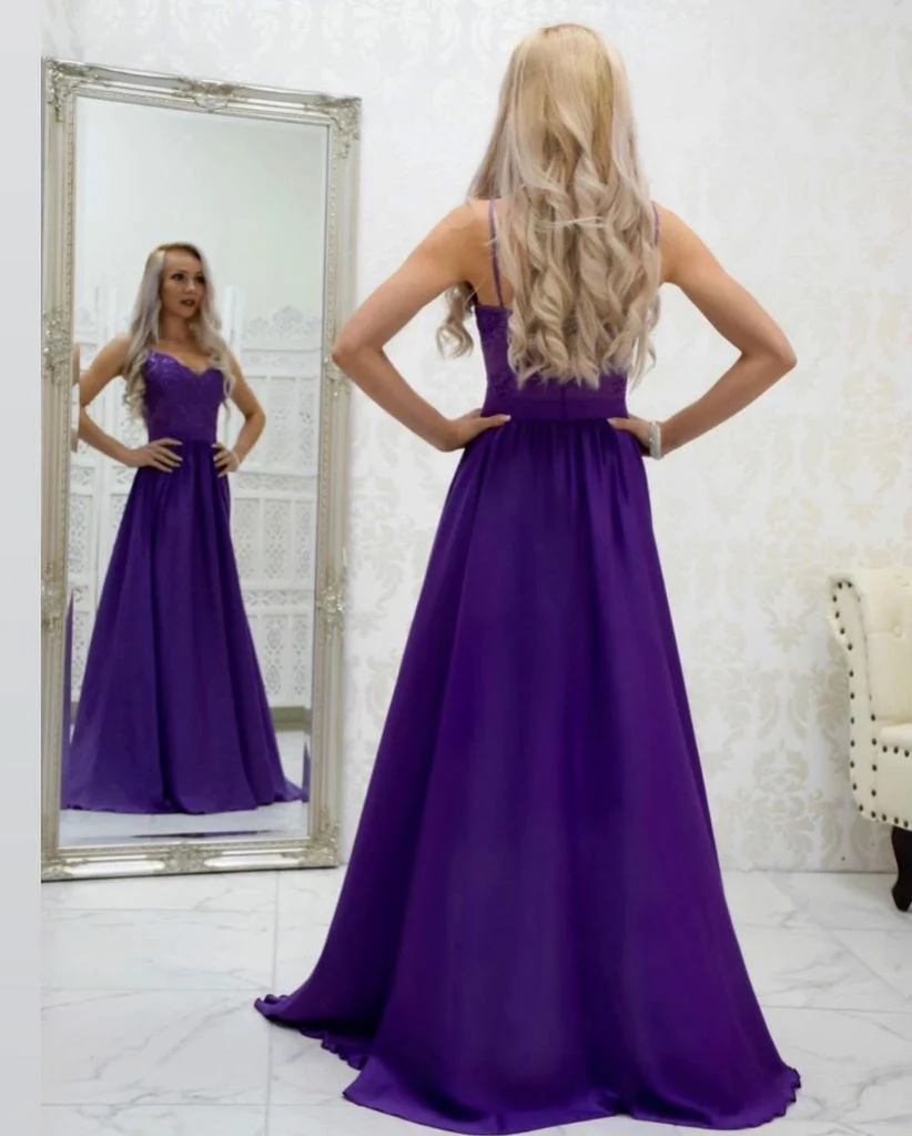 • A-line Spaghetti Straps Grape Long Satin Prom Dress Lace Top Formal Gowns OKR54