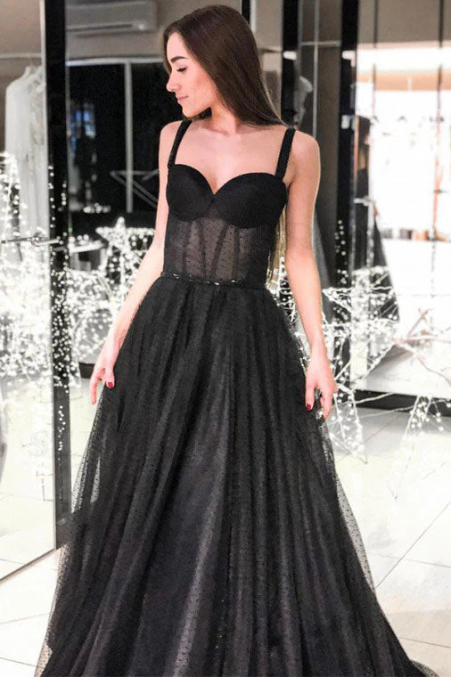 A-Line Spaghetti Straps Long Prom Dress Sleeveless Black Evening Dress OKS78
