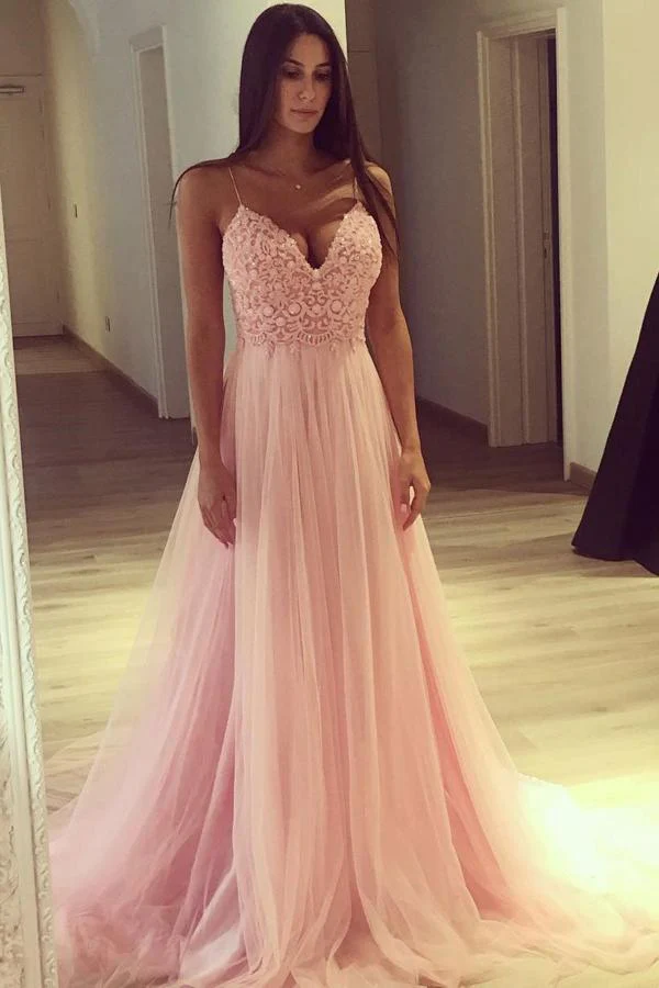 A Line Spaghetti Straps Pink Tulle Long Prom Dresses OKE87