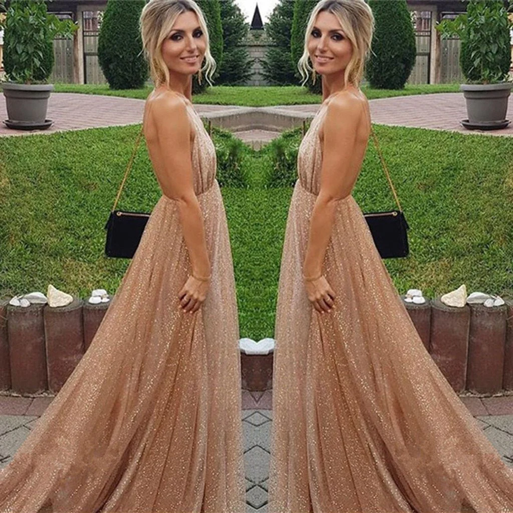 A-line Spaghetti Straps V-neck Sexy Backless Sequins Prom Party Dress OKF32