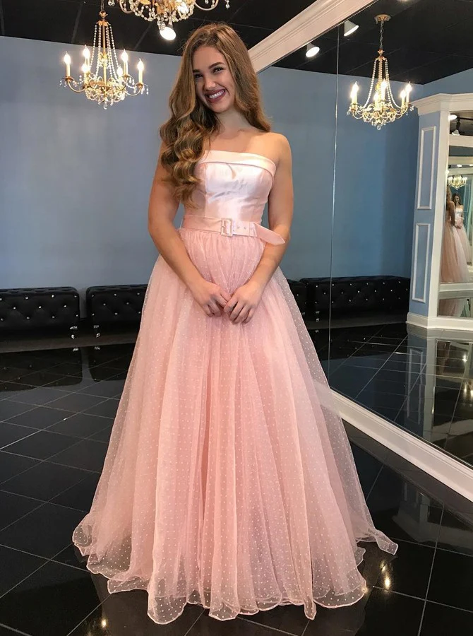 • A-Line Strapless Floor-Length Pink Tulle Prom Dresses with Belt OKL67