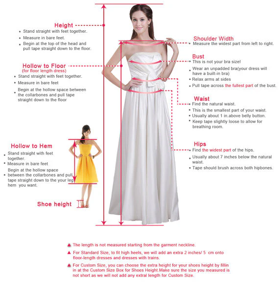 Size Unit: Please refer to the above standard size chart carefully if you choose standard size, to make sure the standard size fit you well. Sizes?(bust)/(waist)/(hips)/(Hollow to Floor) are very important.If you need to do custom?size, please provide?sizes listed below: