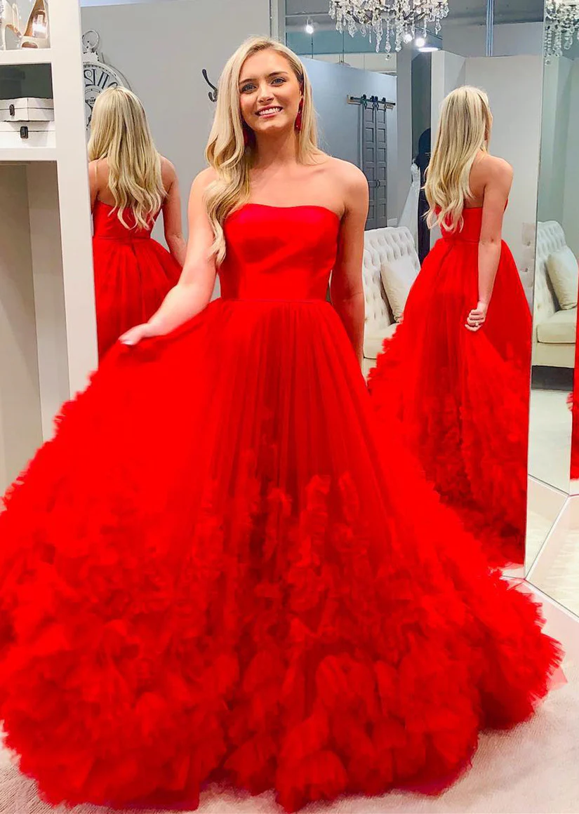 A-Line Strapless Long Prom Dresses with Train OKO55
