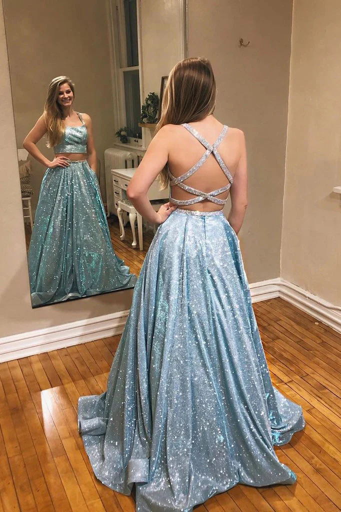 A-line Two Pieces Spaghetti Straps Sparkly Long Prom Dress Evening Dress OKT3