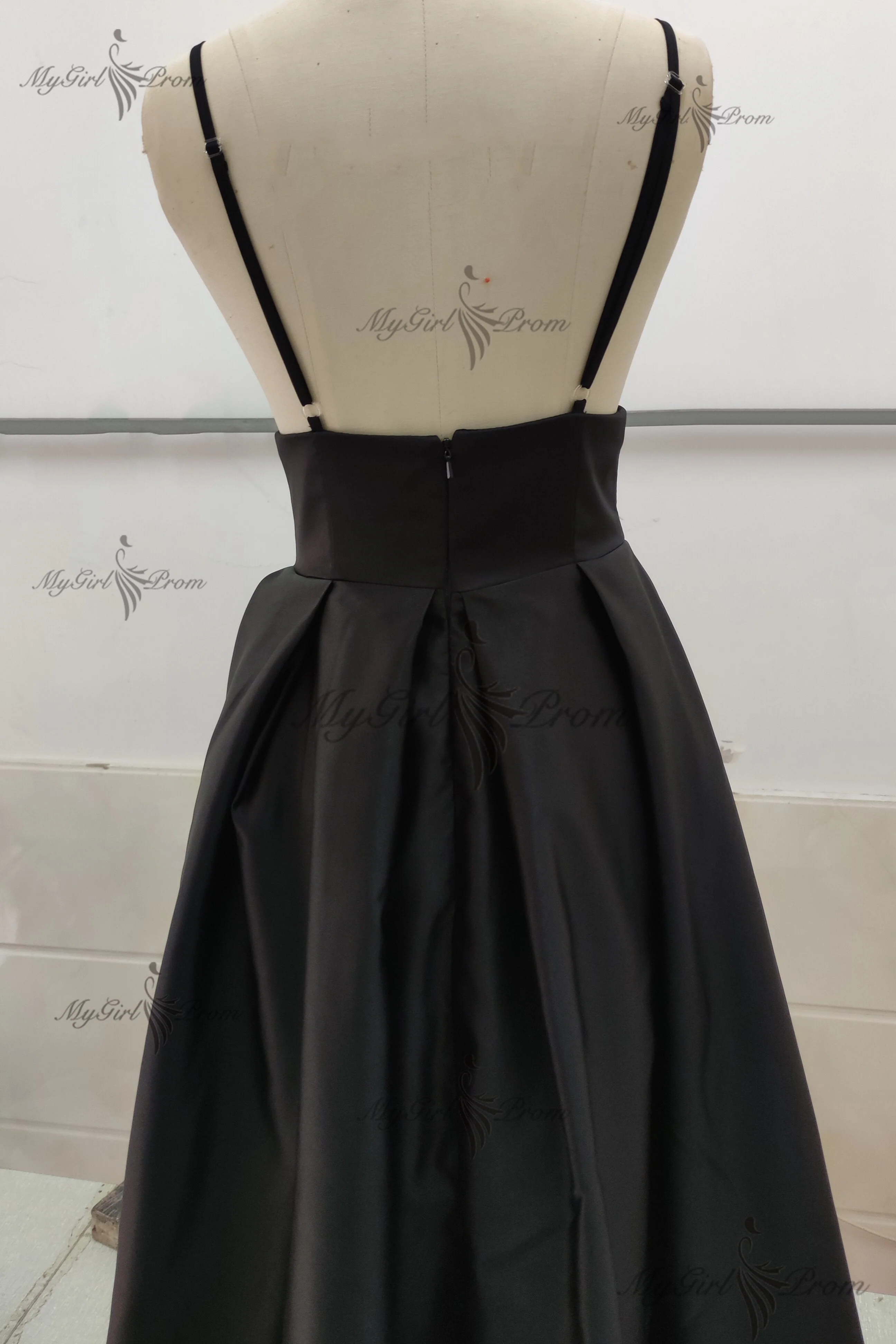 • A Line V Neck Black Long Prom Dress SatinFormal Evening Dress With Pockets OK1280