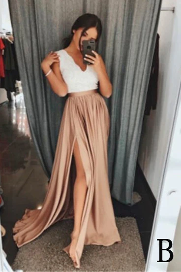 • A-Line V-Neck Elastic Satin Long Split Prom Dresses with Lace Top OKB23