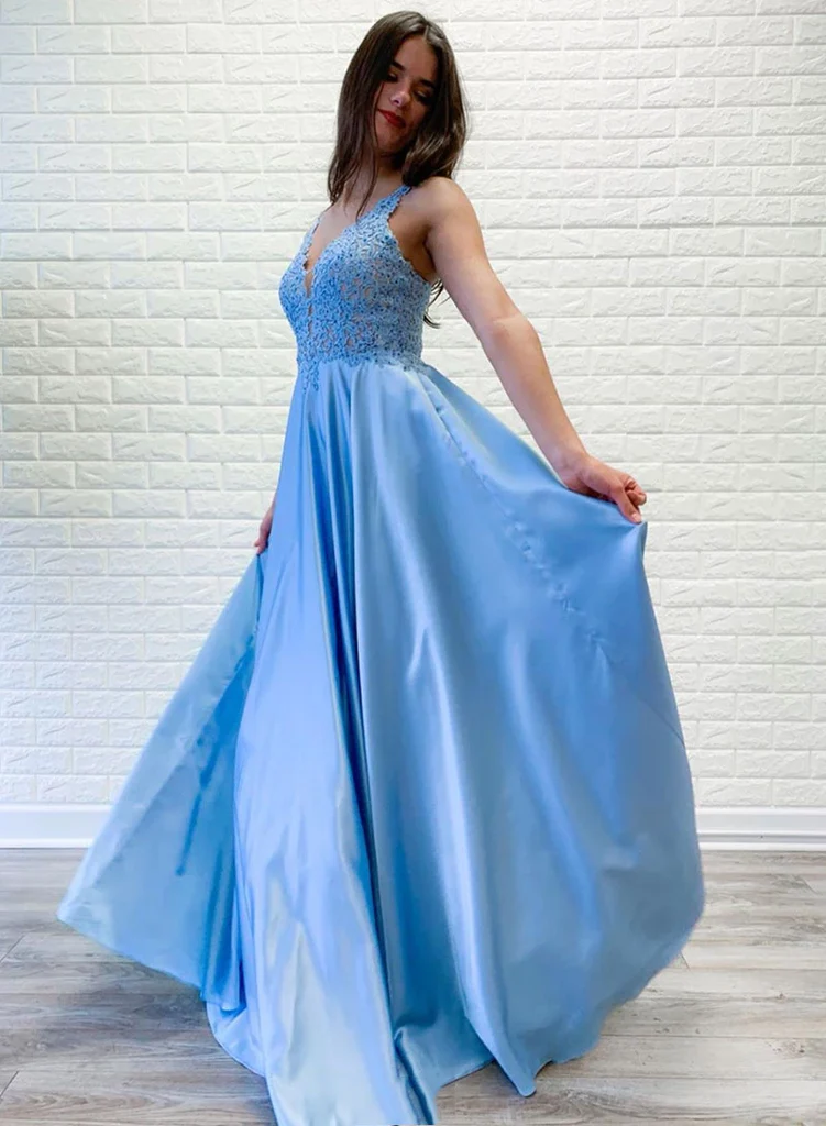 • A-line V-neck Lace Appliques Long Satin Prom Dress Blue Evening Party Dress OKR67