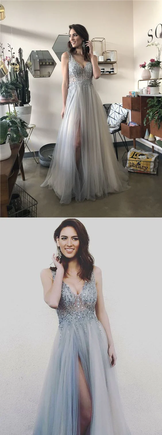 • A-Line V Neck Long Grey Tulle Split Prom Party Dresses with Sequins OKF70