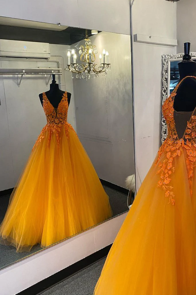 A-line Orange Tulle Lace Appliques Prom Dress Formal Evening Dress OKZ6