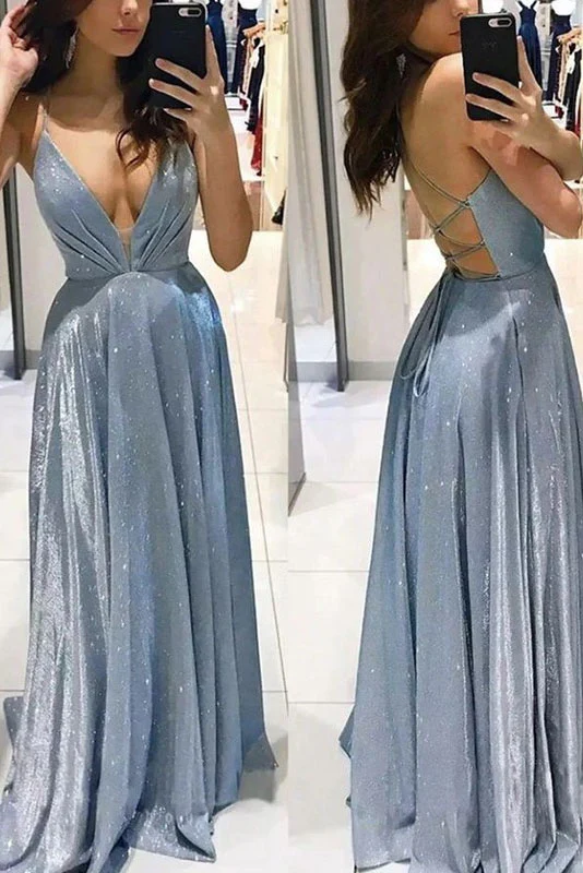A Line V-neck Sleeveless Spaghetti Straps Long Sexy Prom Dresses OK1820