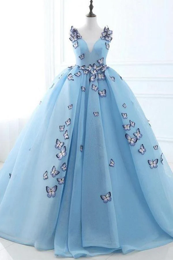 • Ball Gown Long Sky Blue Butterfly V Neck Prom Dresses,Quinceanera Dresses OKE79