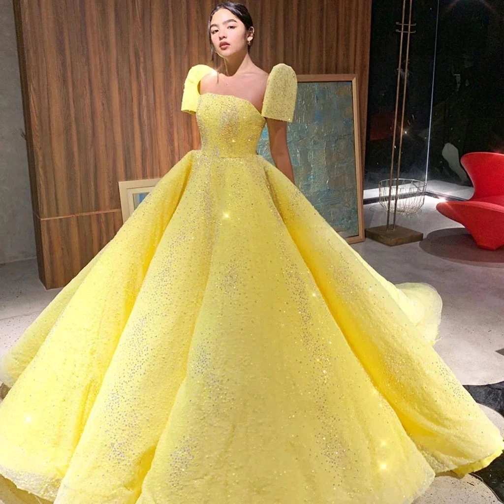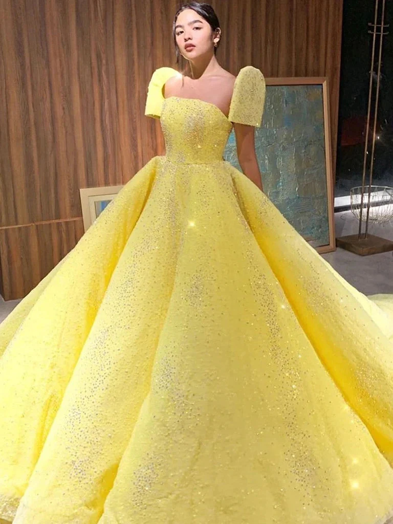 • Ball Gown Sparkly Yellow Short Sleeves Prom Dress Evening Dress OKT15