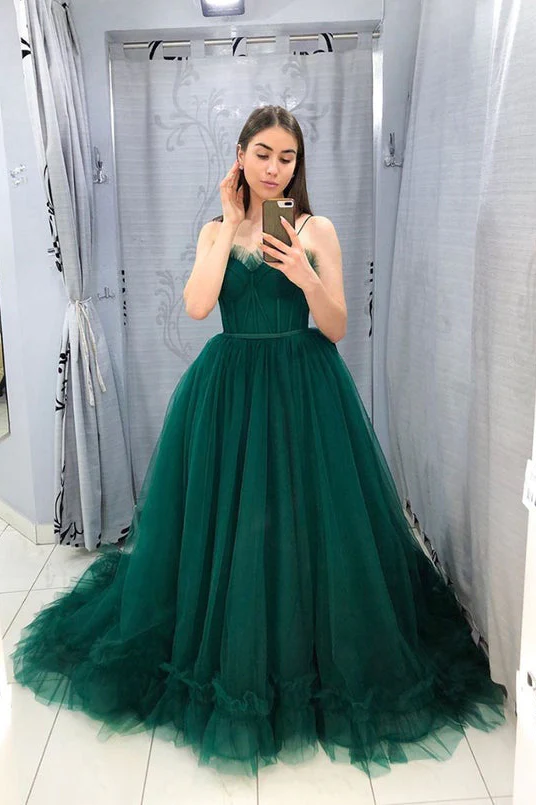 • Ball Gown Tulle Green Long Prom Dress Spaghetti Straps Formal Evening Dress OK1231
