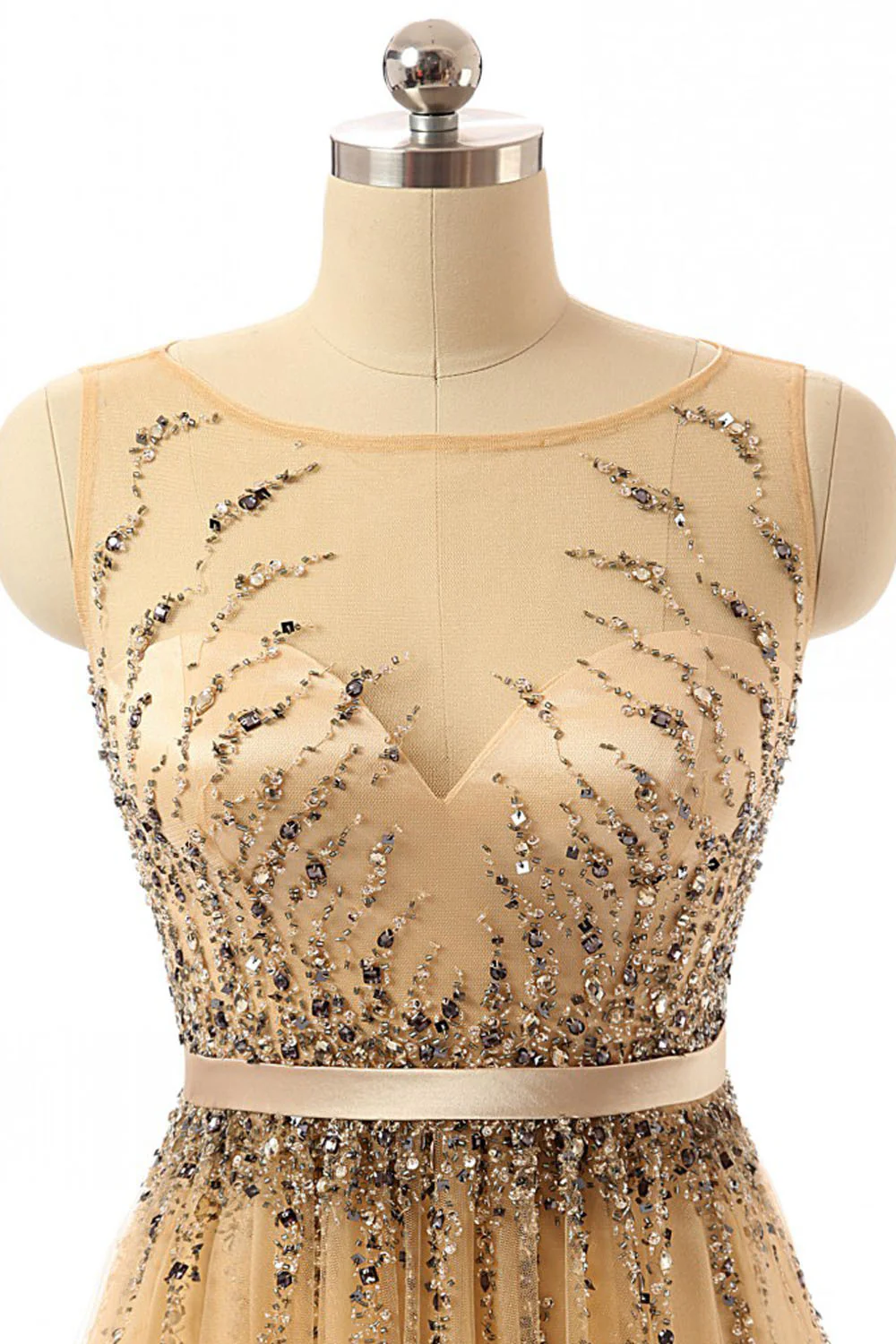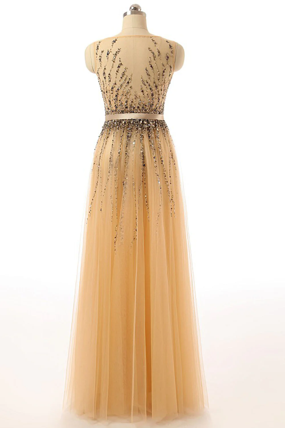 • Beaded Gold Long Cap Sleeves Modest Prom Dresses ED0855