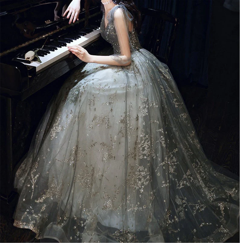 • Beaded Tulle Fairy Prom Dress For Women V-Neck Long Party Dress Floor Length Evening Dress OKV92