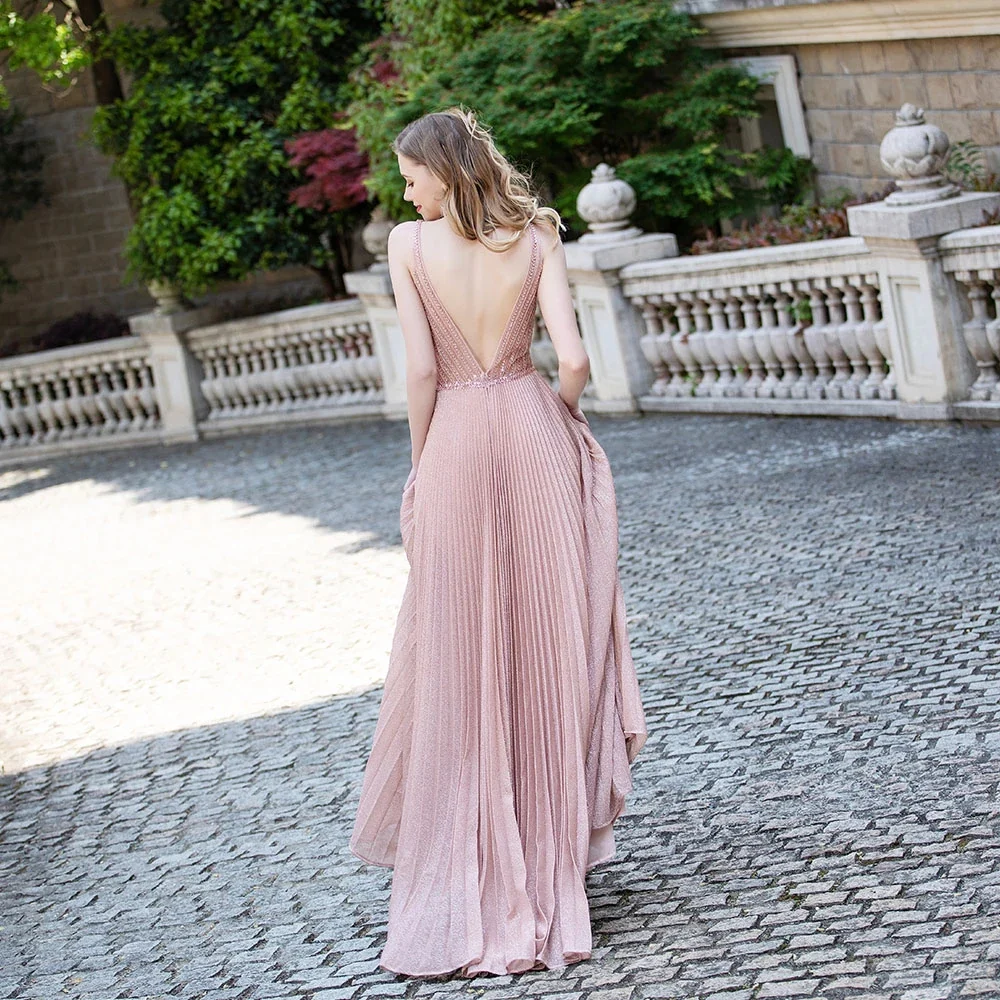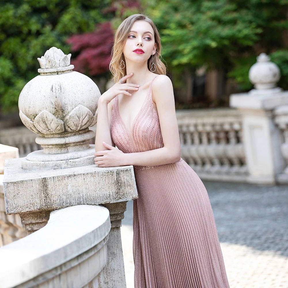 Beautiful Pink Sleeveless Long Prom Dress New Beading Glitter V Neck Pleated Party Gown OKW57
