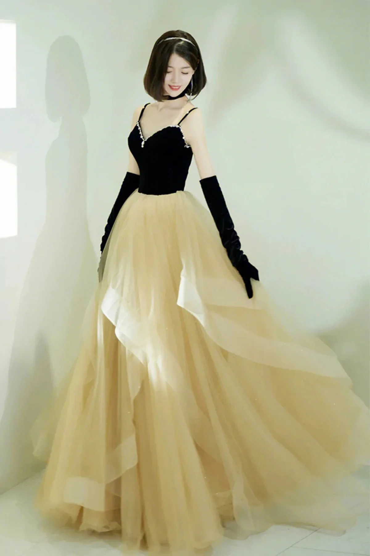 • Black A Line Tulle Long Prom Dresses, Spaghetti Straps Evening Party Dresses OK1921