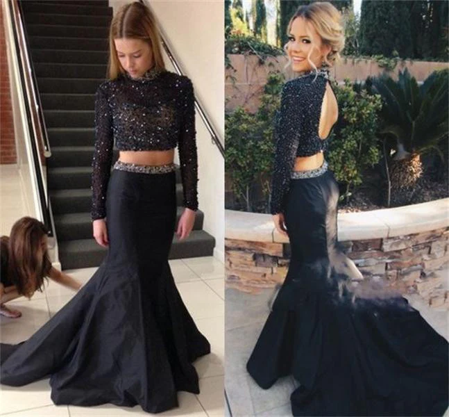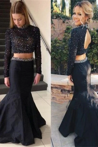 • Black Beaded Long Sleeves Two Pieces Mermaid Backless Prom Dress K678