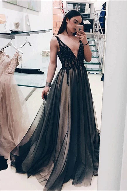 • Black Deep V Neck A-Line Prom Dresses,Long Tulle Evening Dress OKD27