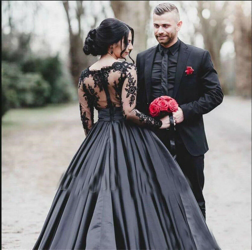 • Black Gothic A-line Lace Appliqued Long Sleeves Prom Dress OKW61