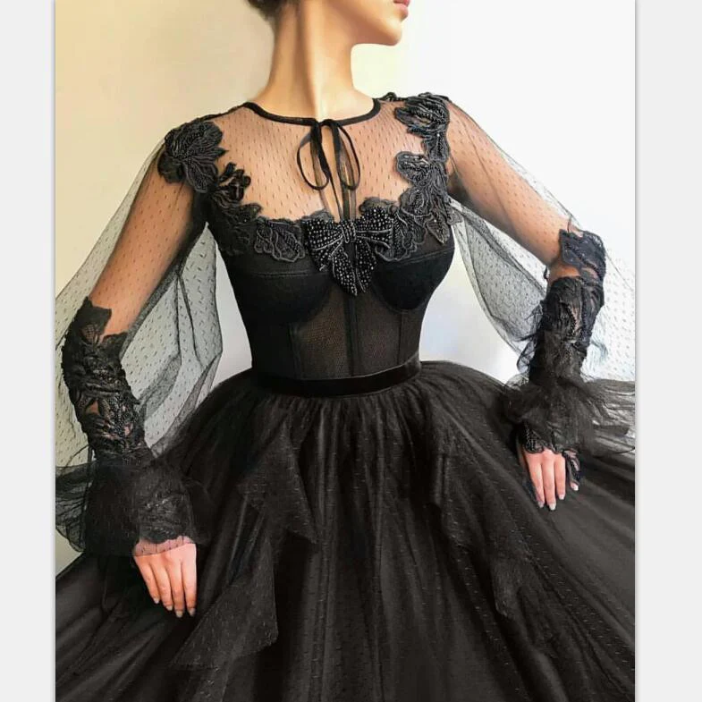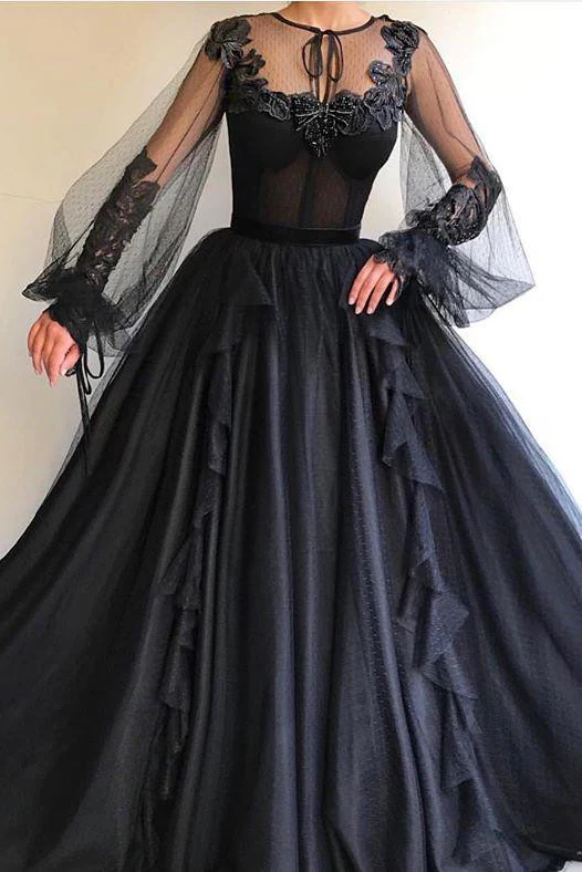 • Black Long A-line Tulle Prom Dresses, Long Sleeves Modest Evening Gown OKG82
