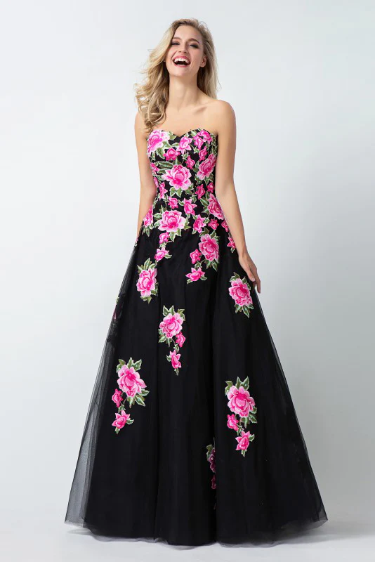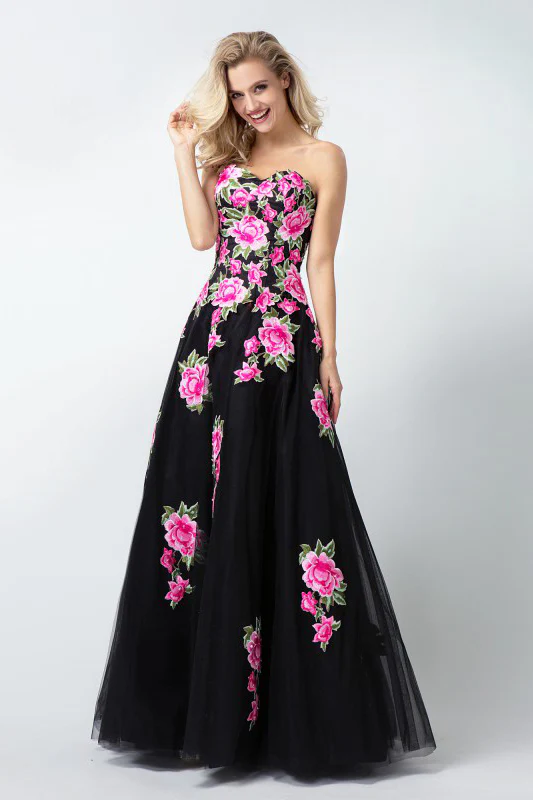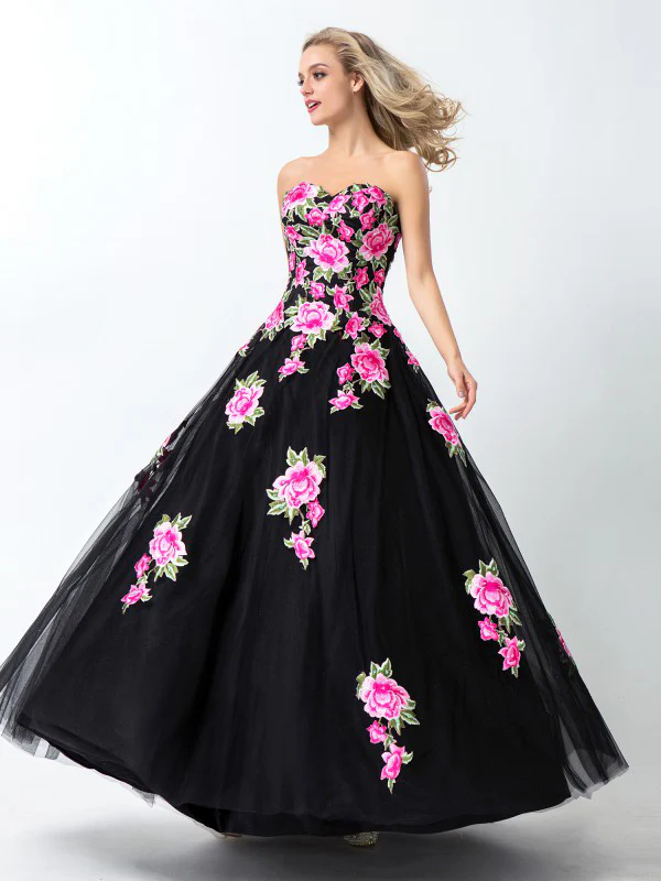 • Black Sweetheart Flower Appliques Long A Line Tulle Prom Dress,Evening Dresses OKA69
