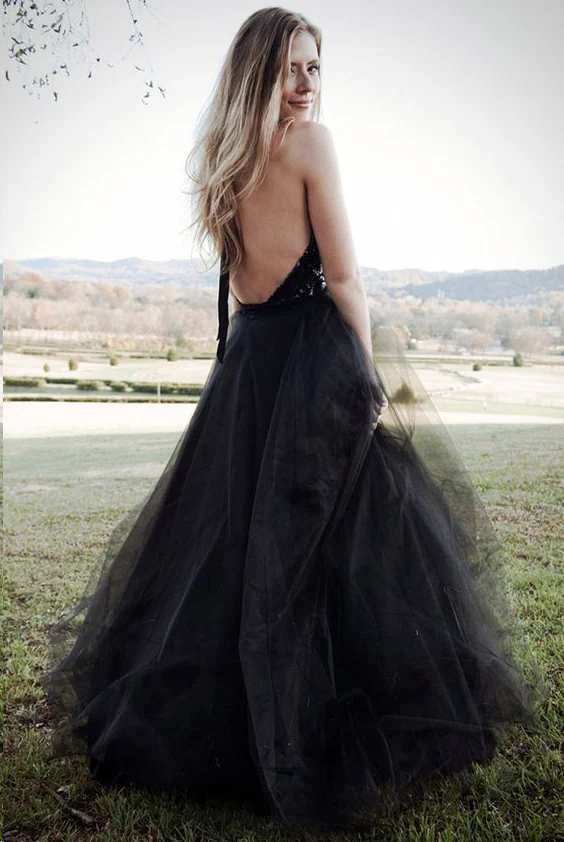• Black Tulle Backless Halter A Line Cheap Long Prom Dress Sexy Evening Dresses OKG27