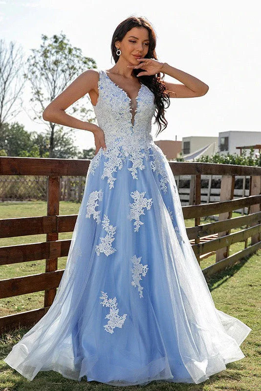 Blue A Line/Princess Tulle Appliques V-neck Sleeveless Long Prom Dress OK1364