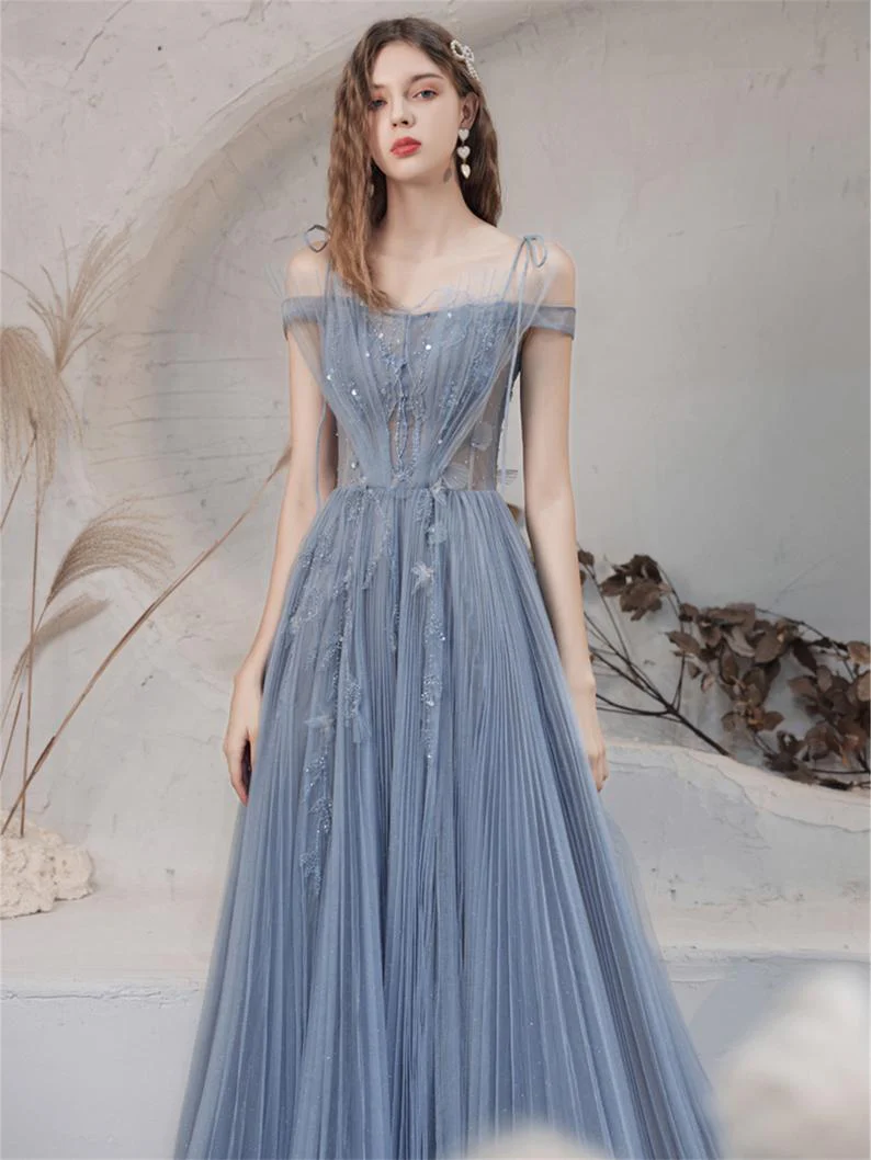 • Blue A-line Tulle Prom Dress for Women Long Evening Dress Graduation Dress OKV89