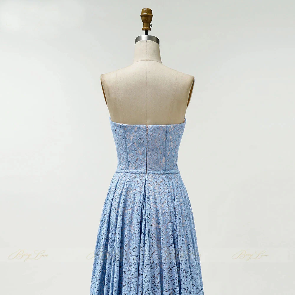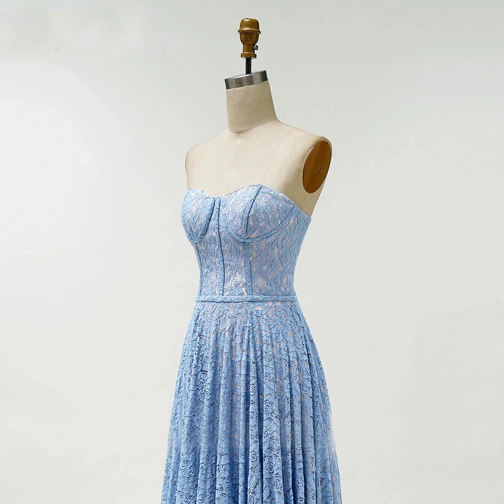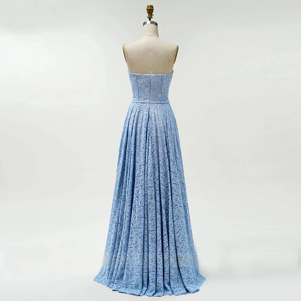 • Blue Long Evening Dress Lace Bodice Formal Dress Sweetheart Neck A-line Prom Dress OKW45