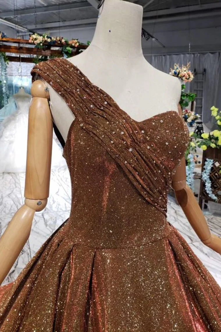 • Brown One Shoulder Lace Up Back Sequins Beads Prom Dress OKL19