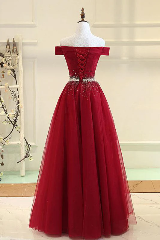 • Burgundy A Line Off the Shoulder Beads Long Prom Dresses OKI52