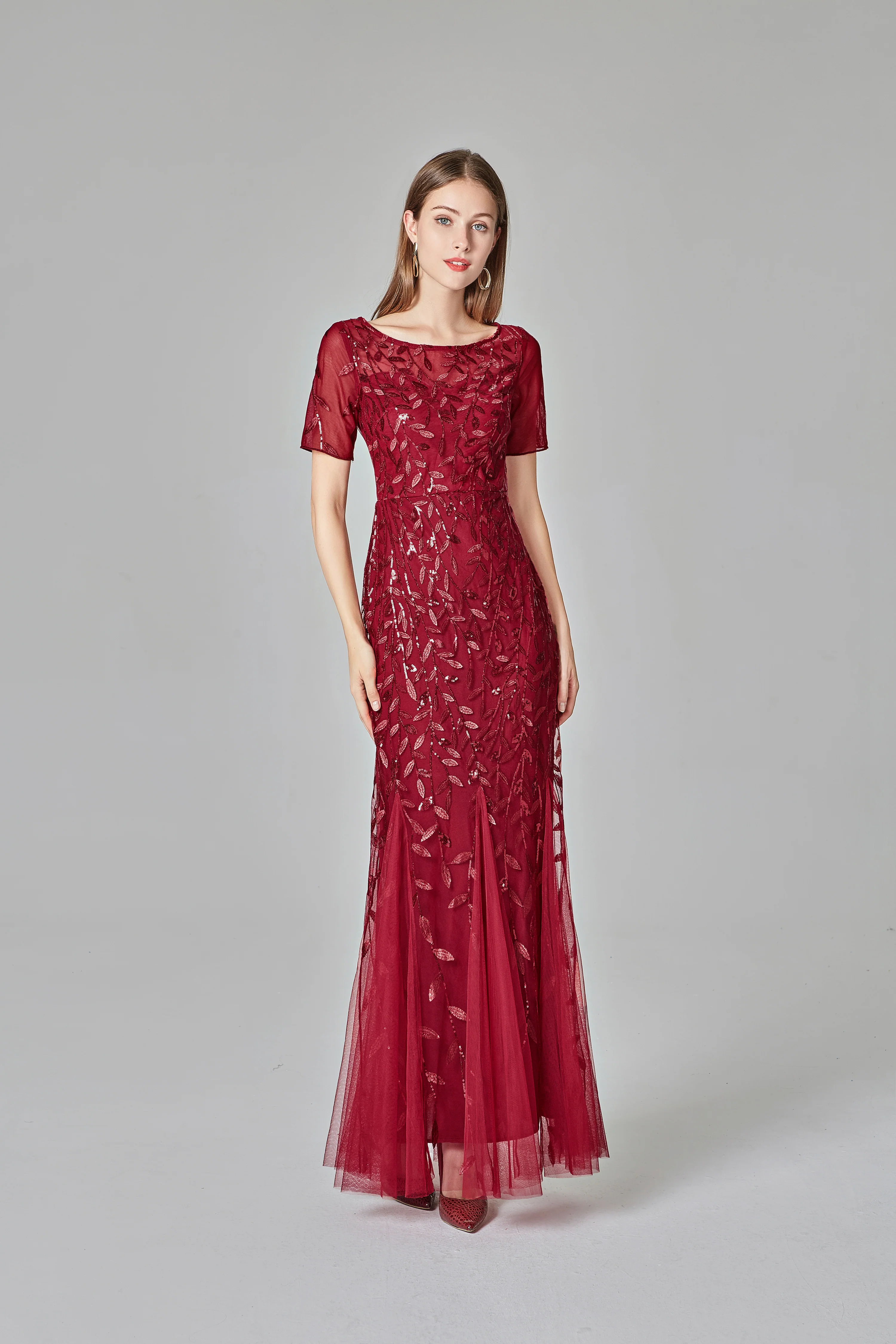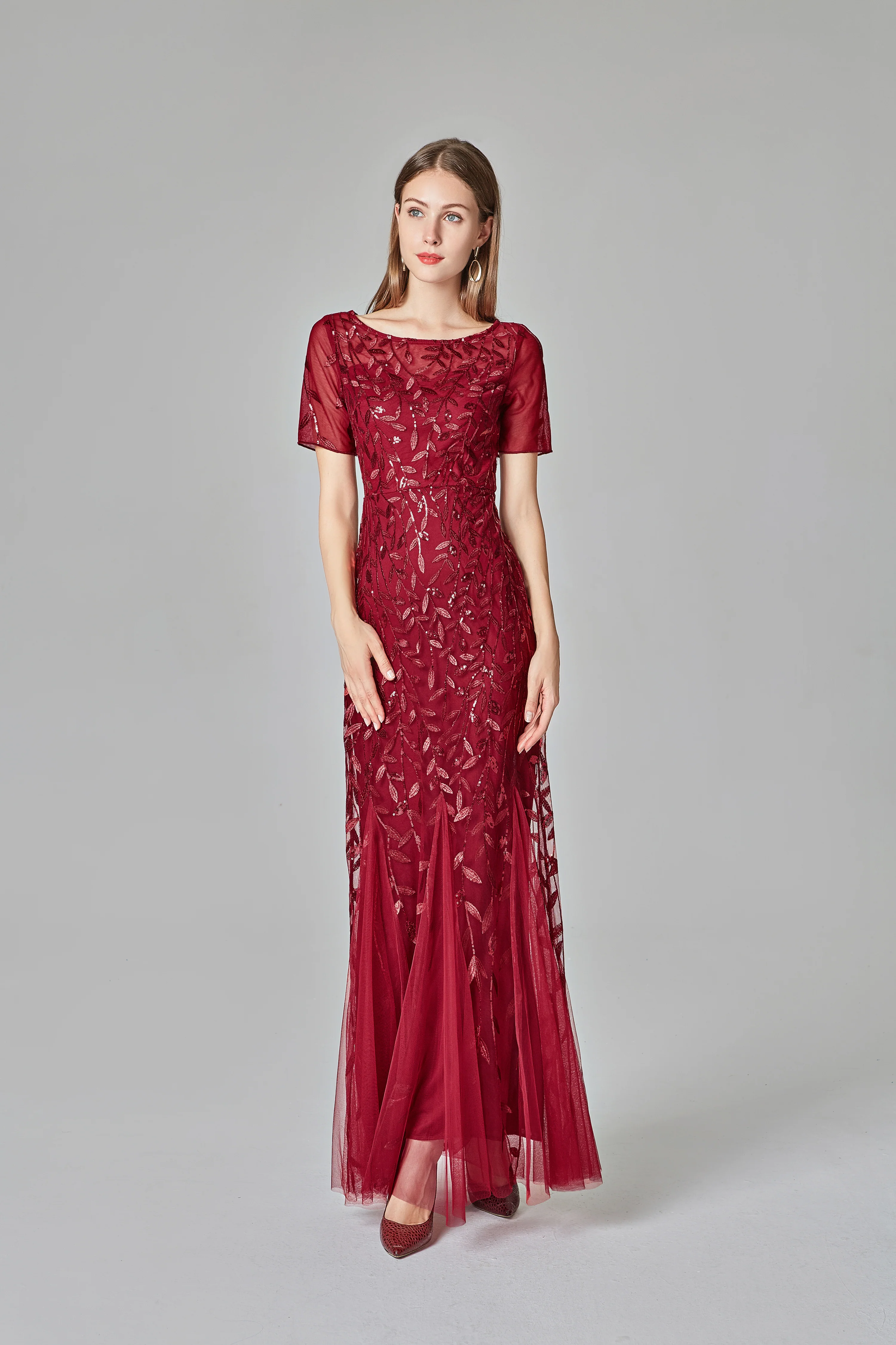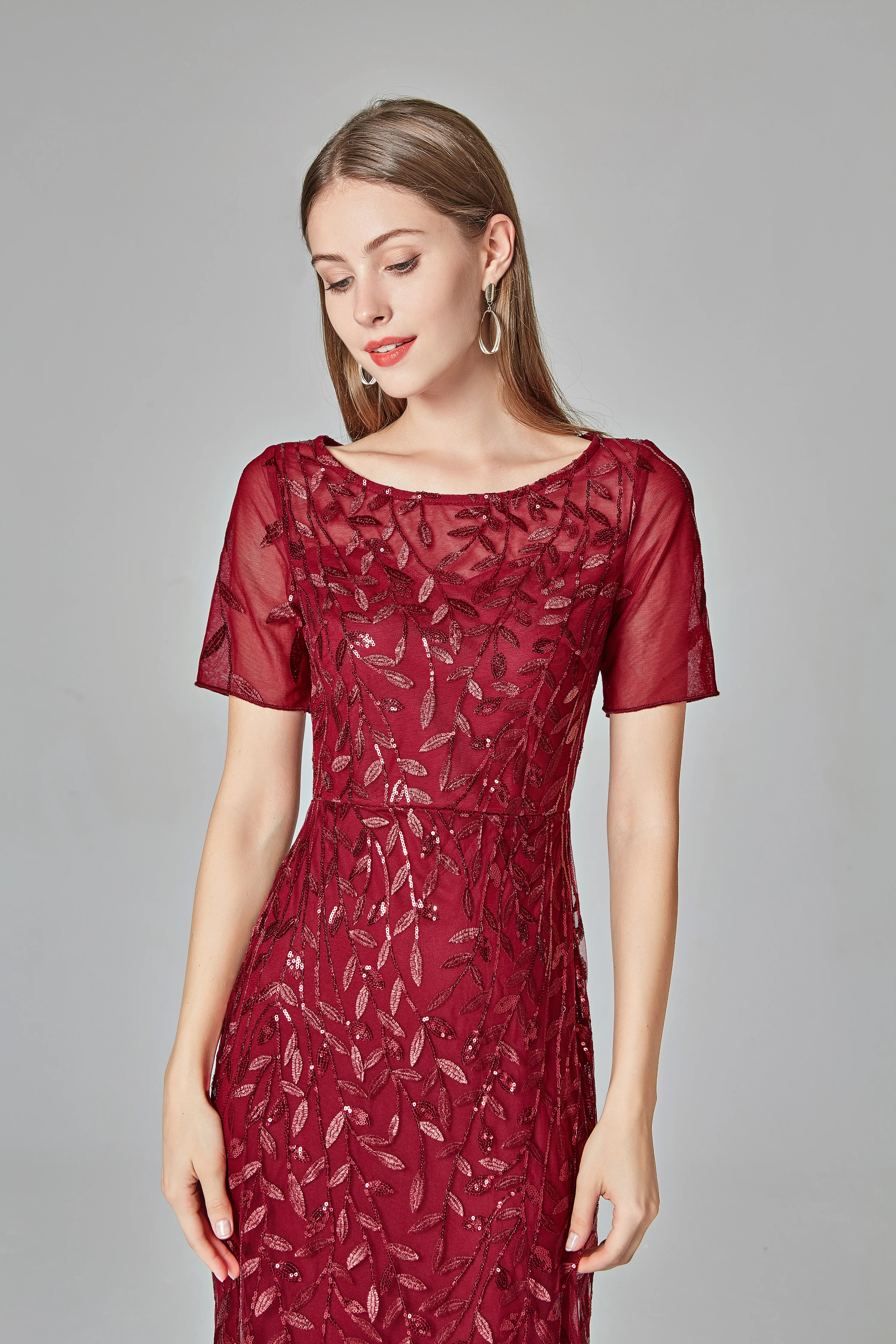 • Burgundy Sheath Short Sleeves Round Long Prom Dress 90801