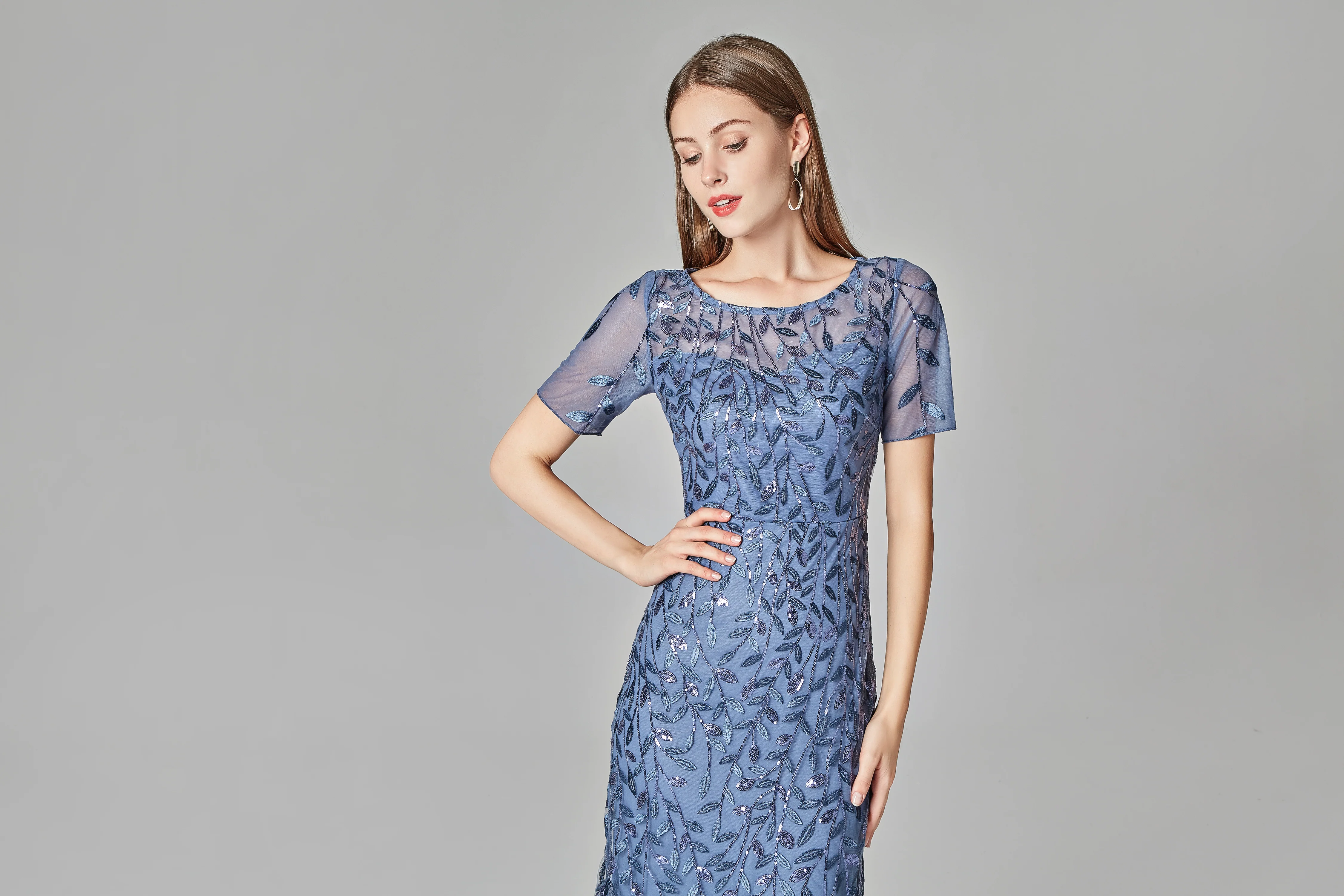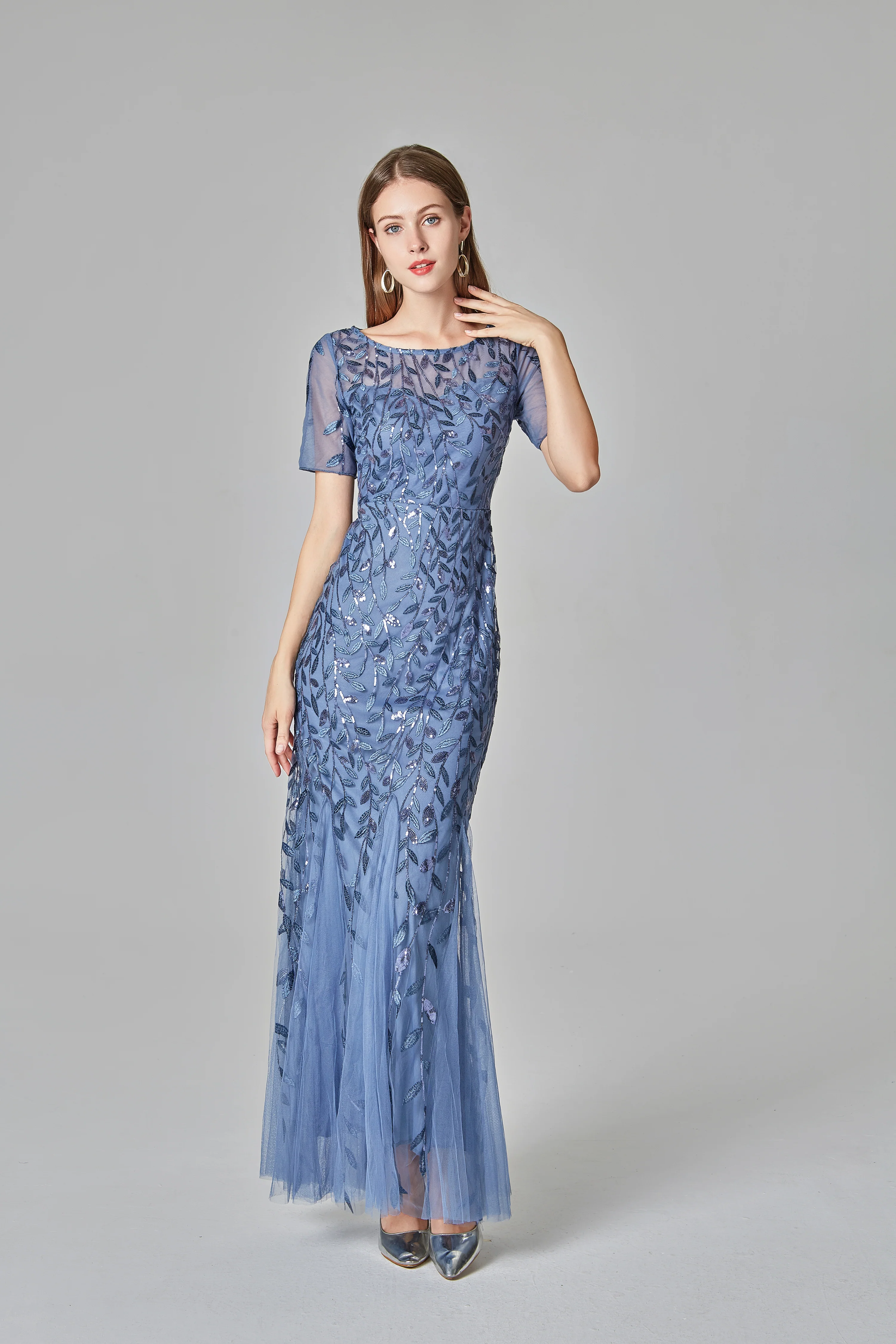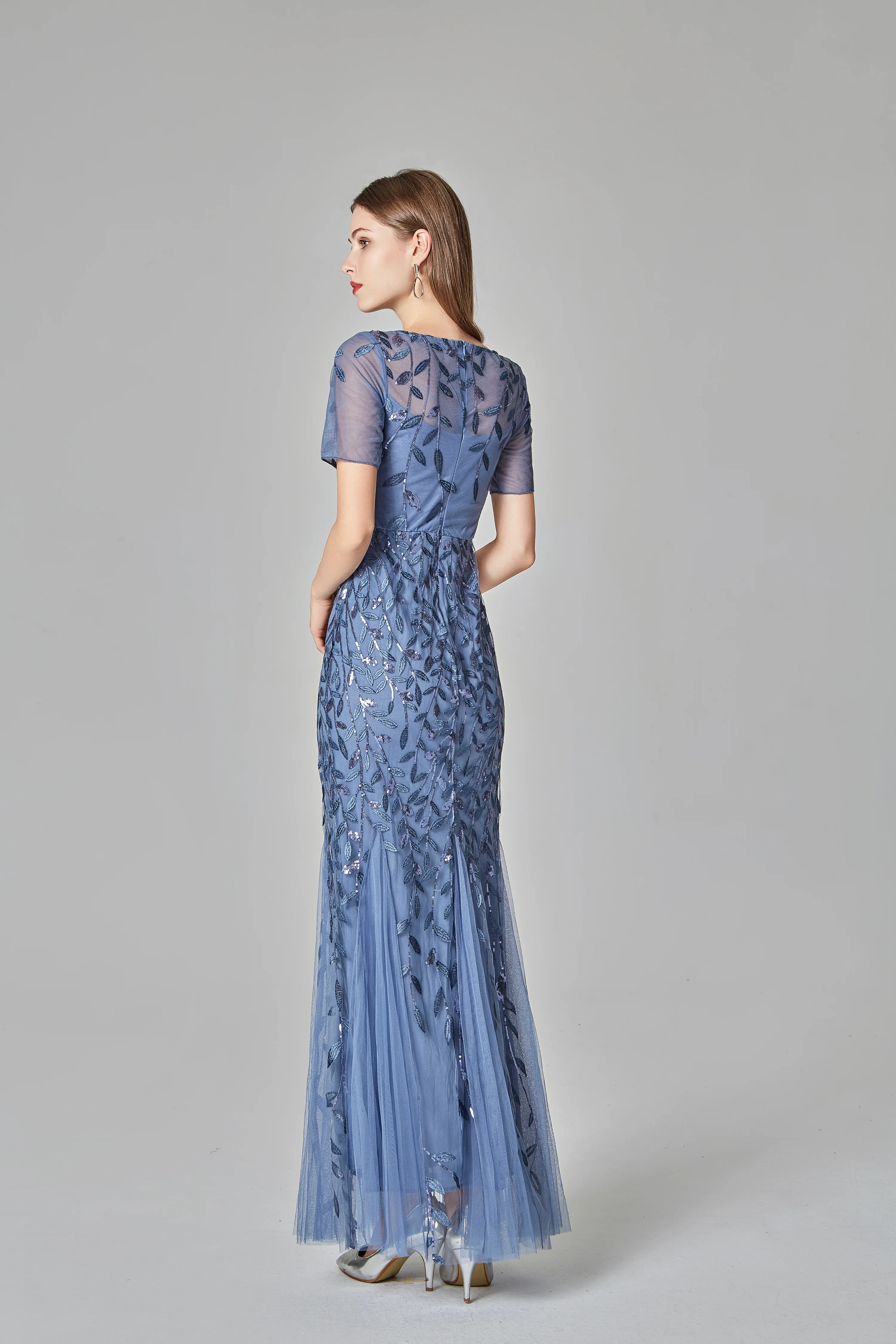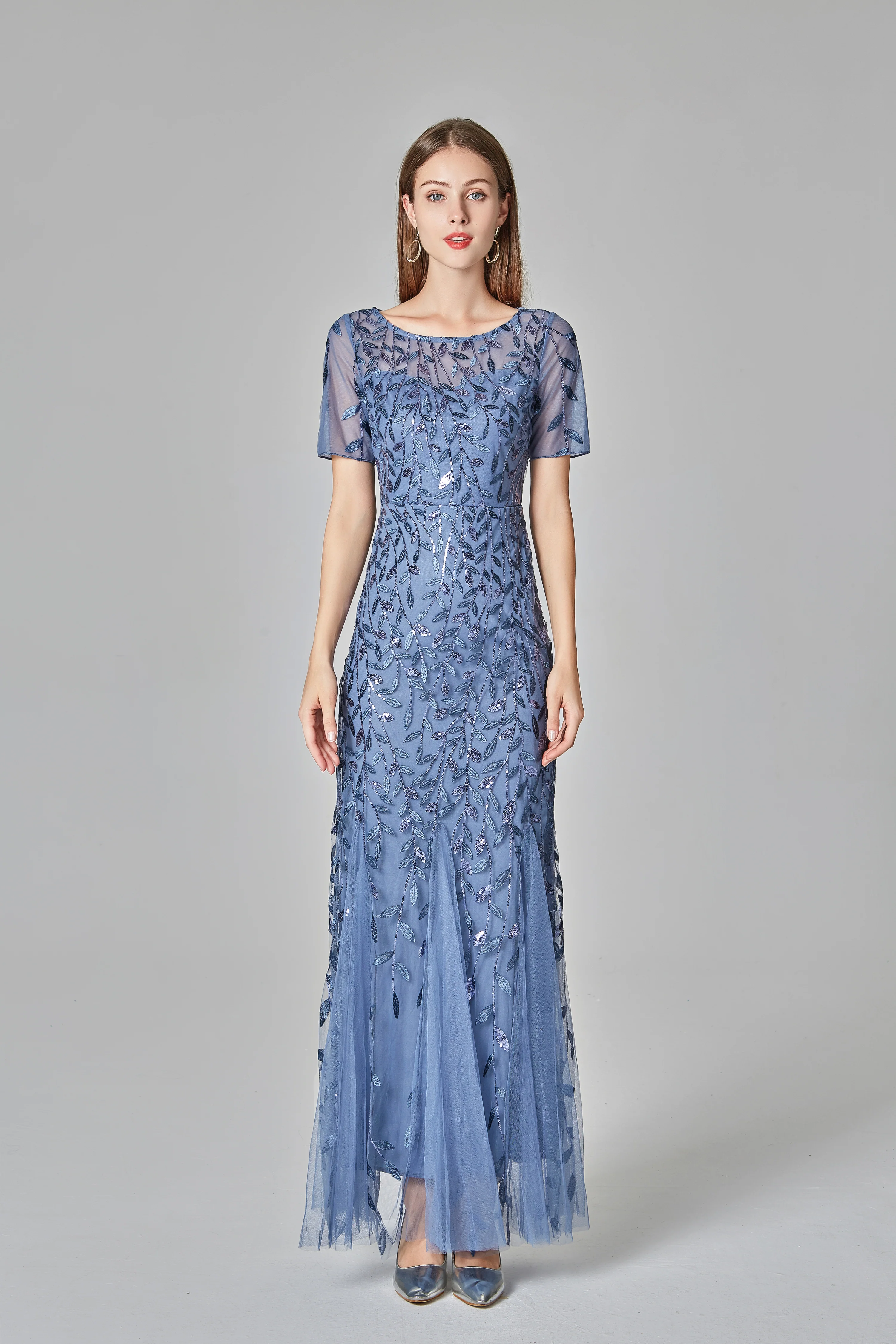 • Burgundy Sheath Short Sleeves Round Long Prom Dress 90801