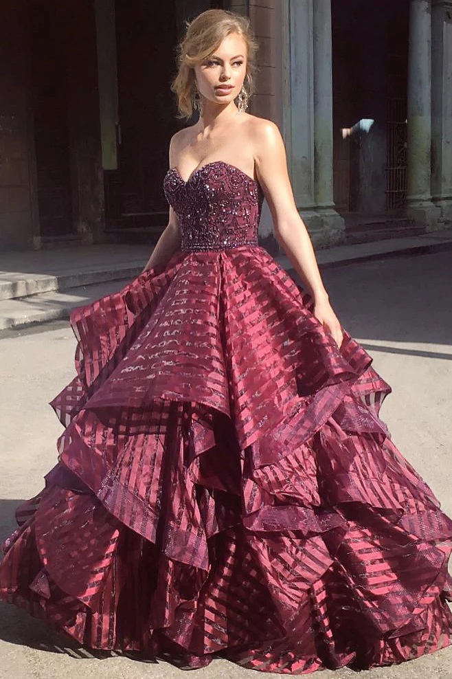 • Charming Ball Gown Sweetheart Strapless Burgundy Long Prom Dresses with Beading OKA13