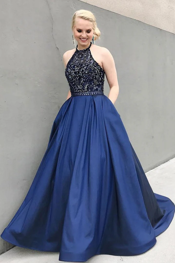 • Charming Beaded Blue Prom Dresses,Long Evening Dresses With Pockets OK985