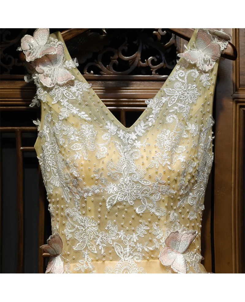 • Charming Flowy Long Tulle V Neck Prom Dresses With Lace Butterflies OK989