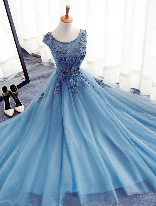 Charming Long Tulle Handmade A Line Blue Prom Gowns,Best Formal Women Dresses OK243